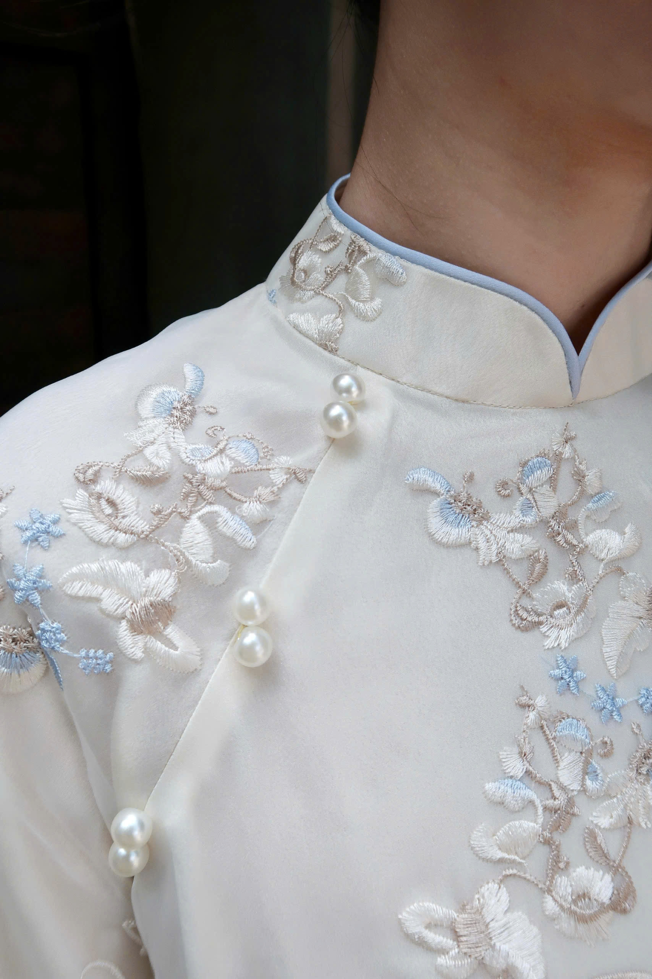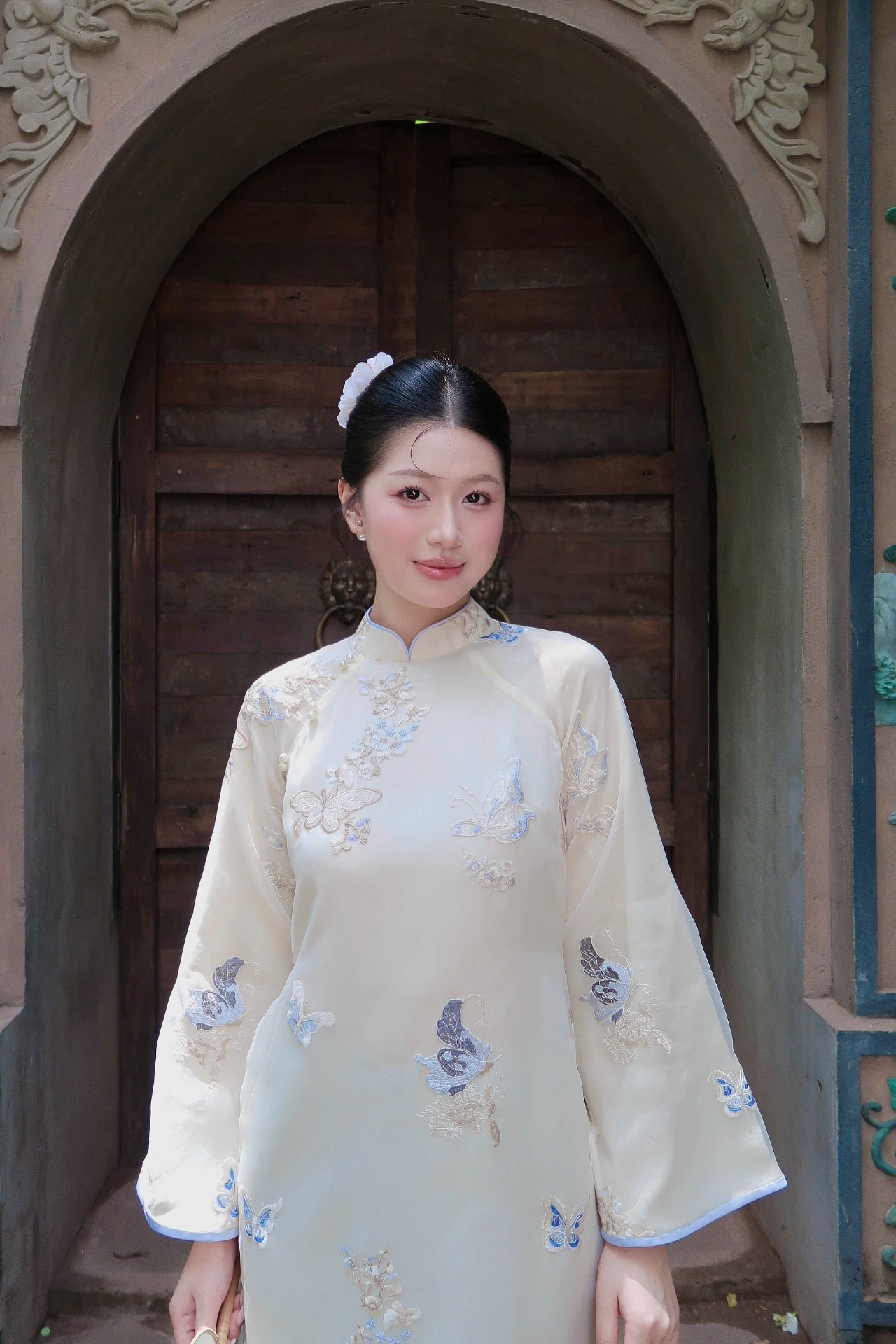 Thiết kế sử dụng chất liệu tơ cao cấp, thêu họa tiết bướm và hoa tinh tế, gợi cảm giác thanh thoát, nhẹ nhàng.