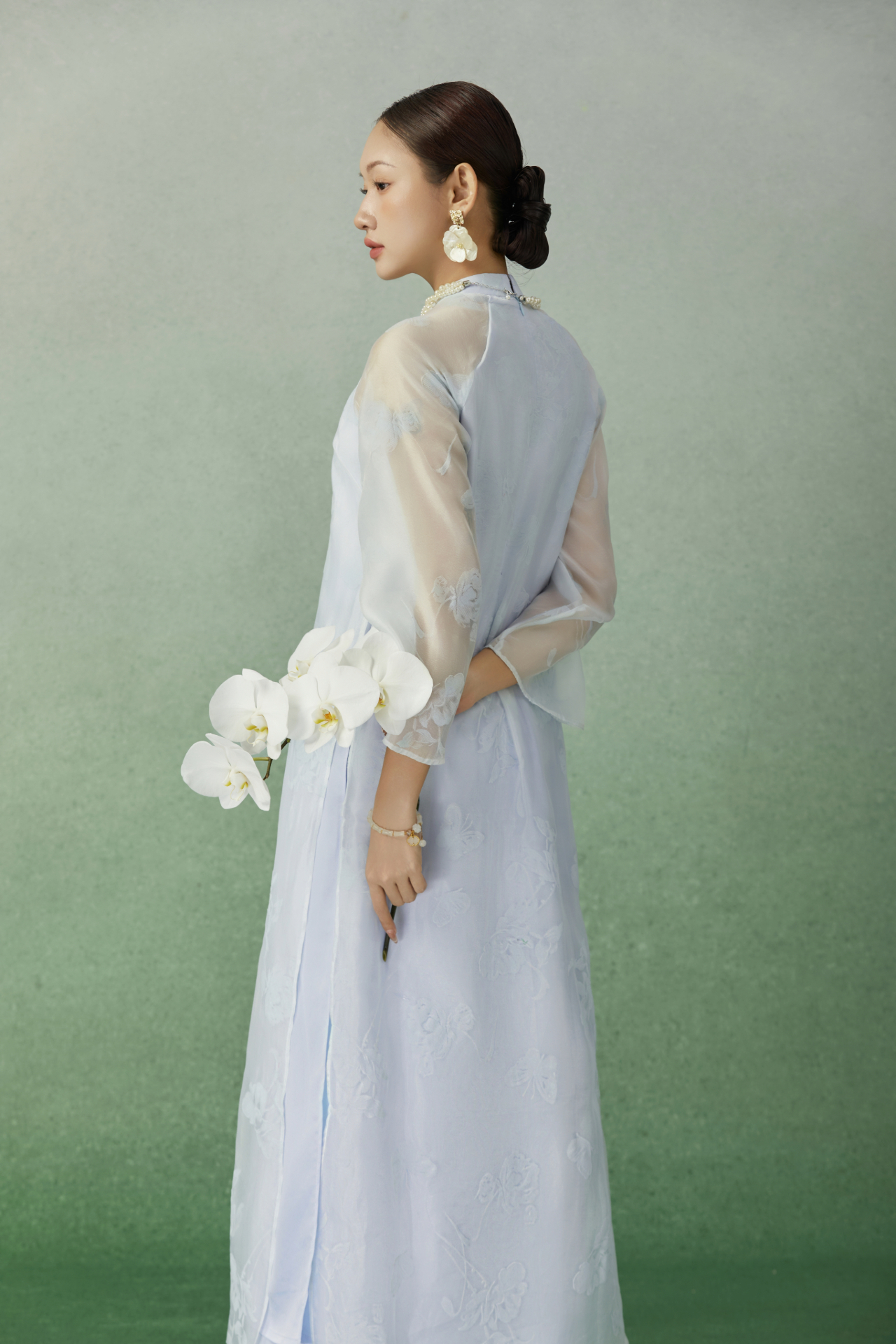 Áo dài dáng suông, vải voan tơ thêu hoạ tiết.