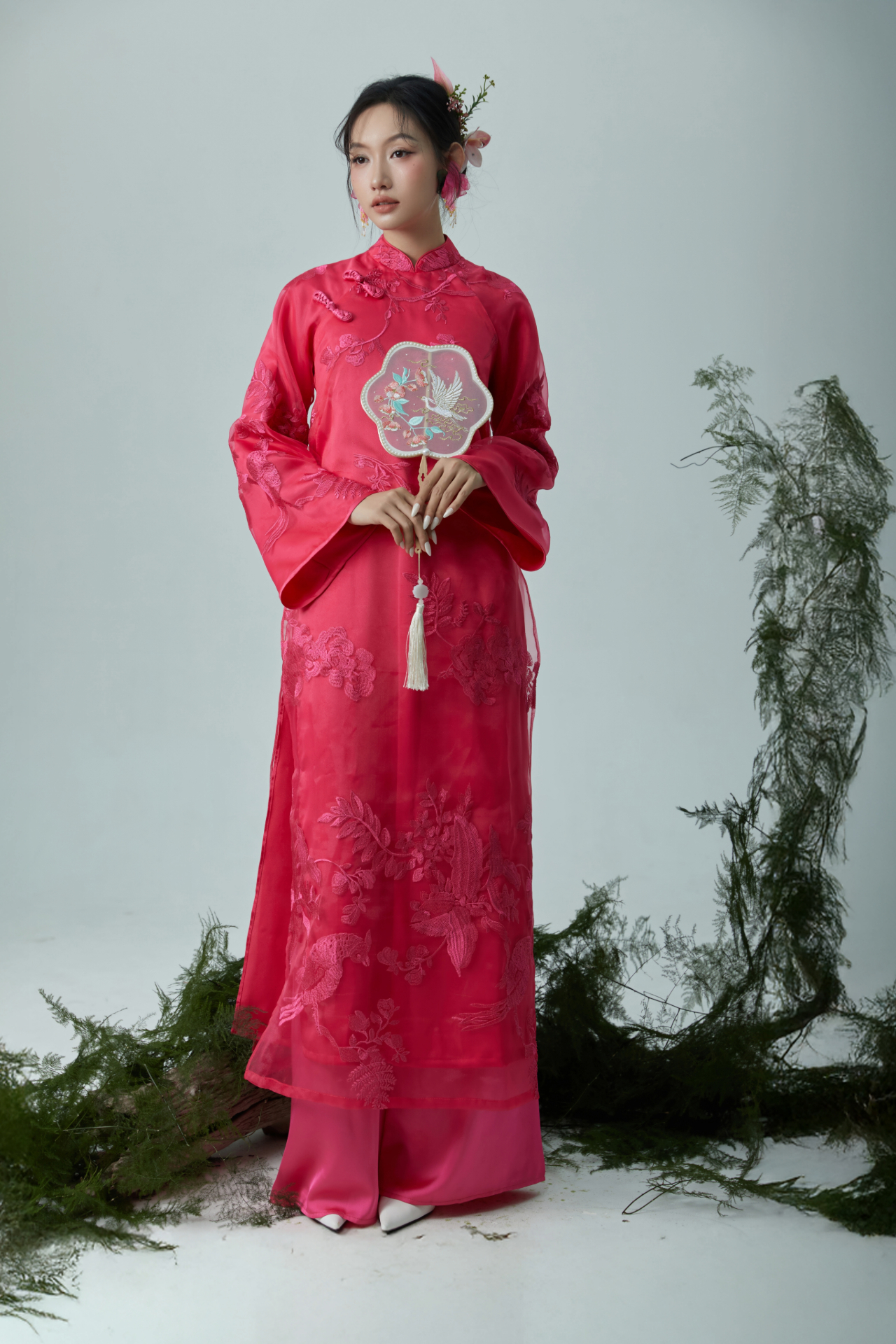 Mẫu áo đỏ hồng thêu hoạ tiết, như viên ngọc quý phản chiếu ánh nắng.