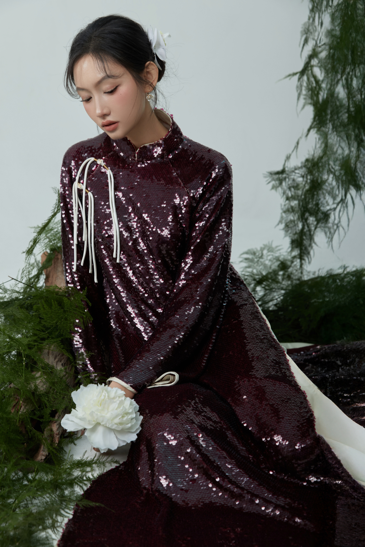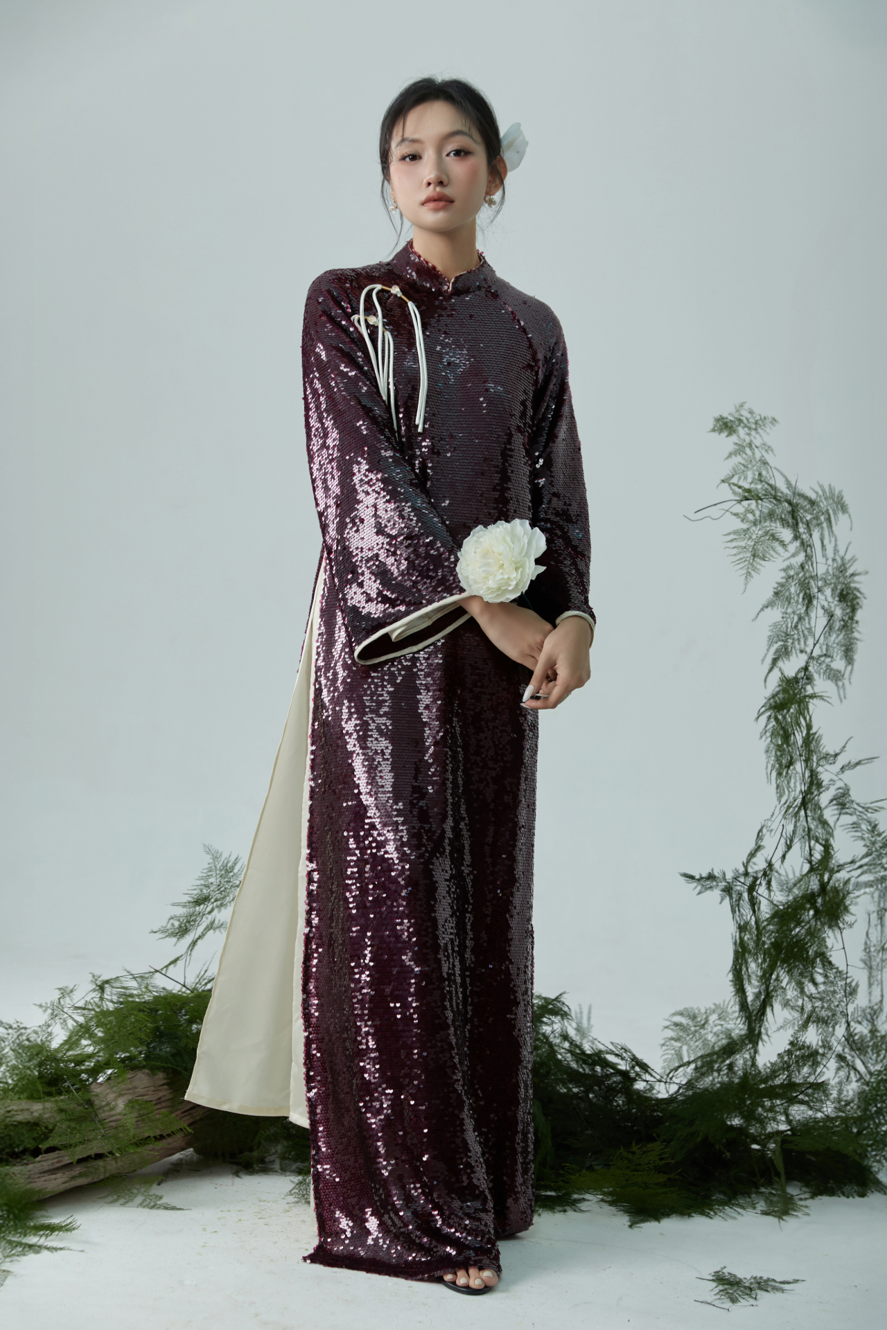 Lớp lót satin màu kem tinh tế giúp tạo độ nổi bật cho từng đường nét thêu tay và đính kết kim sa, đồng thời mang đến cảm giác mềm mại, thoải mái khi mặc.