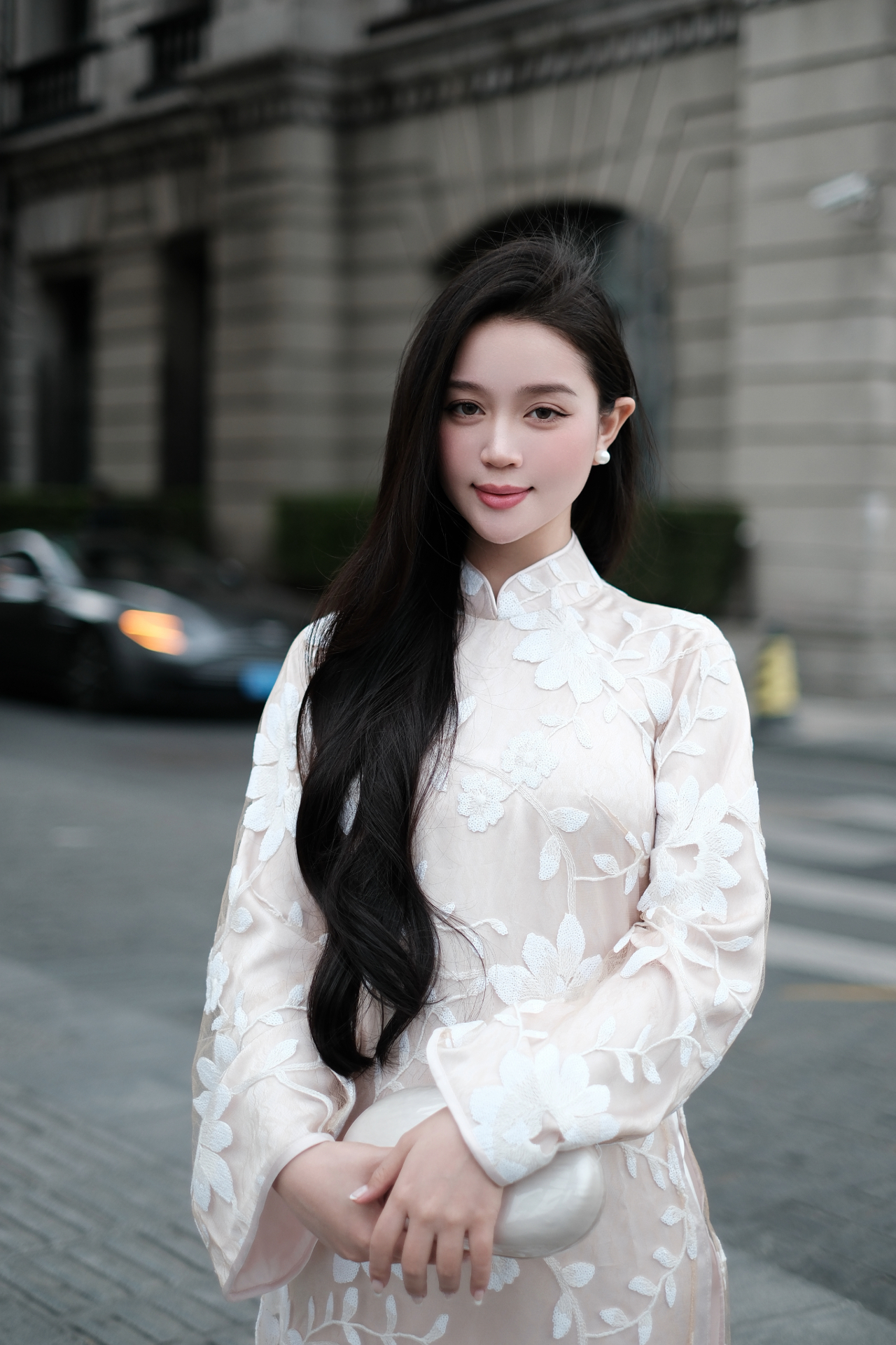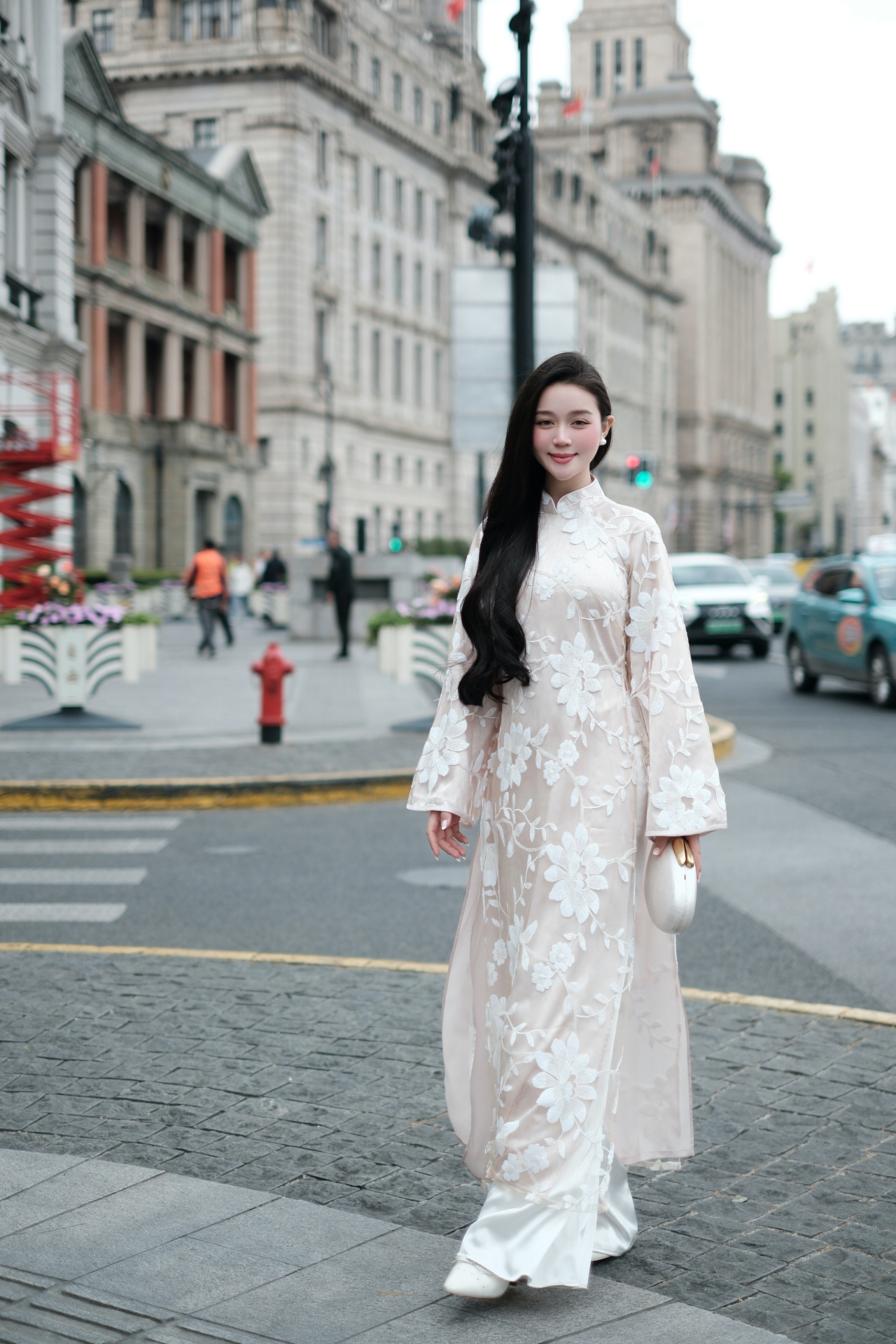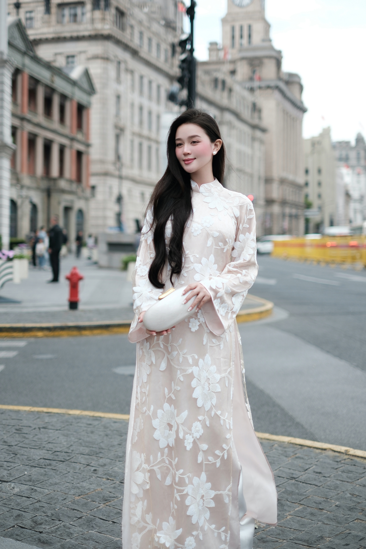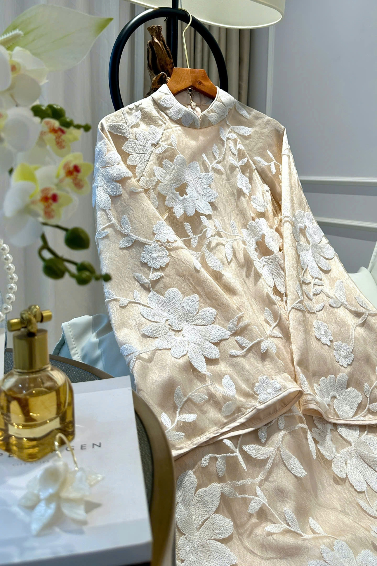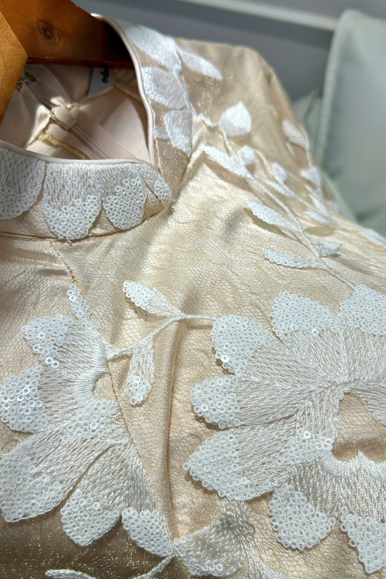 Chiếc áo dài được thiết kế trên nền ren thêu kim sa tỉ mỉ, với họa tiết hoa văn cổ điển pha chút hiện đại, tỏa sáng nhẹ nhàng trong ánh nắng.