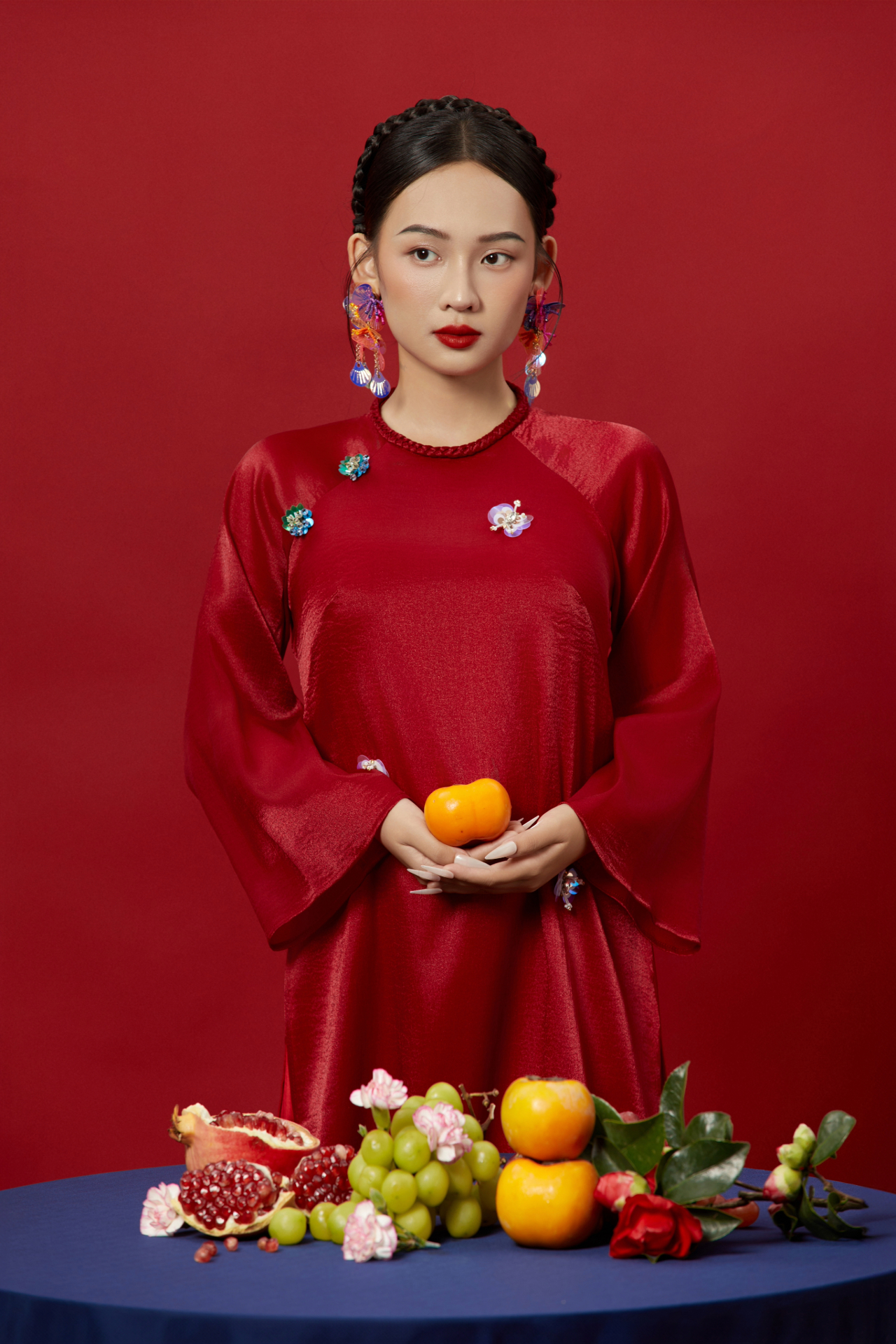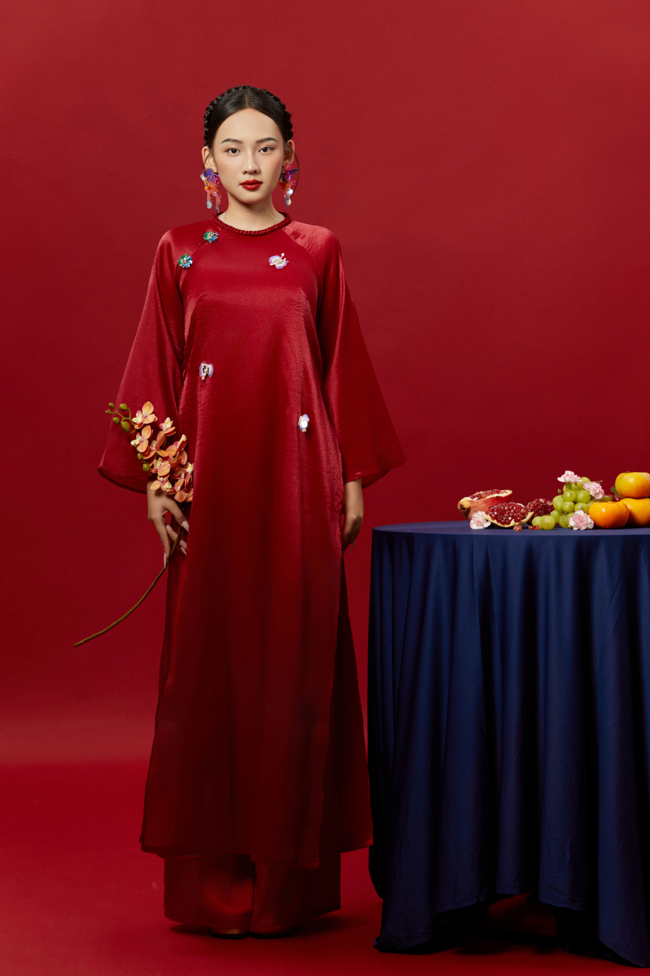 Áo dài dáng suông viền cổ, chất liệu tơ cao cấp.