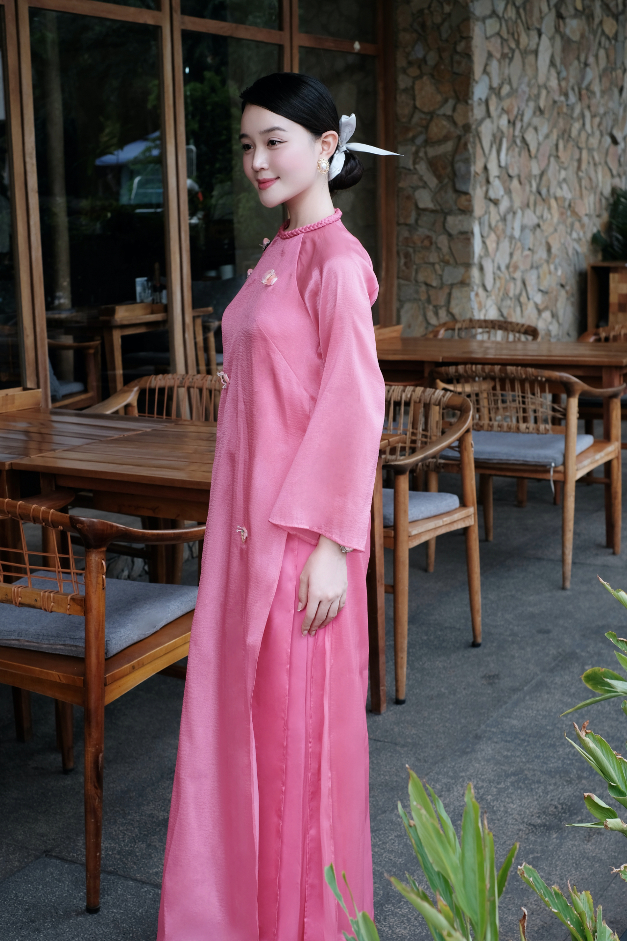 Áo dài dáng suông viền cổ, chất liệu tơ cao cấp.