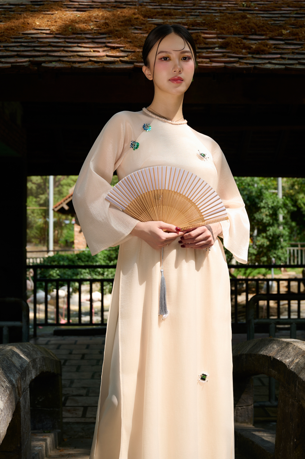 Áo dài dáng suông viền cổ, chất liệu tơ cao cấp.