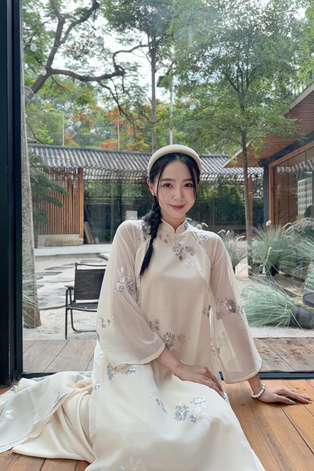 Áo dài cổ trụ dáng suông, chất vải lụa đính kim sa cao cấp.