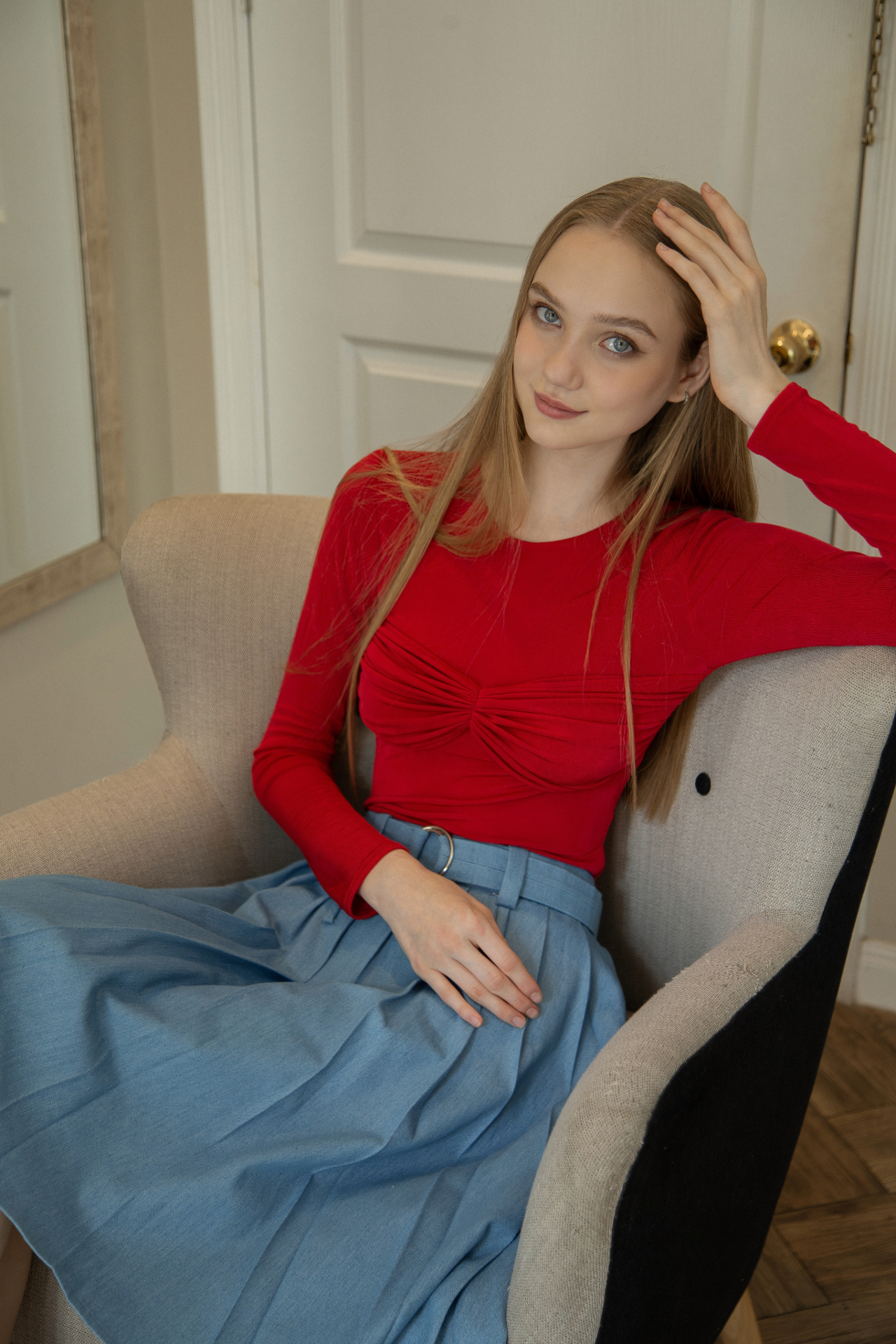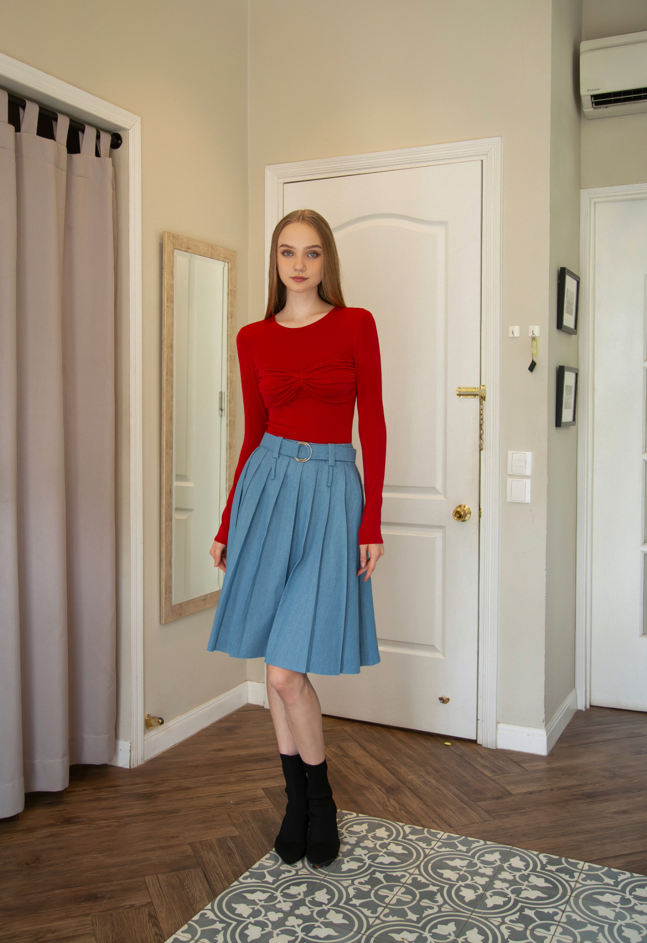 Áo thun tay dài co giãn, xoắn ngực cách điệu.