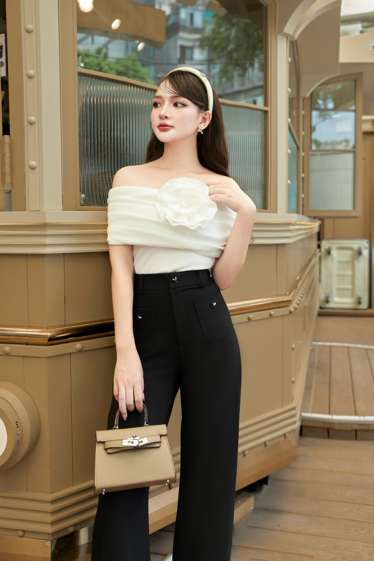 Áo trễ vai chất len lông thỏ, đính hoa.