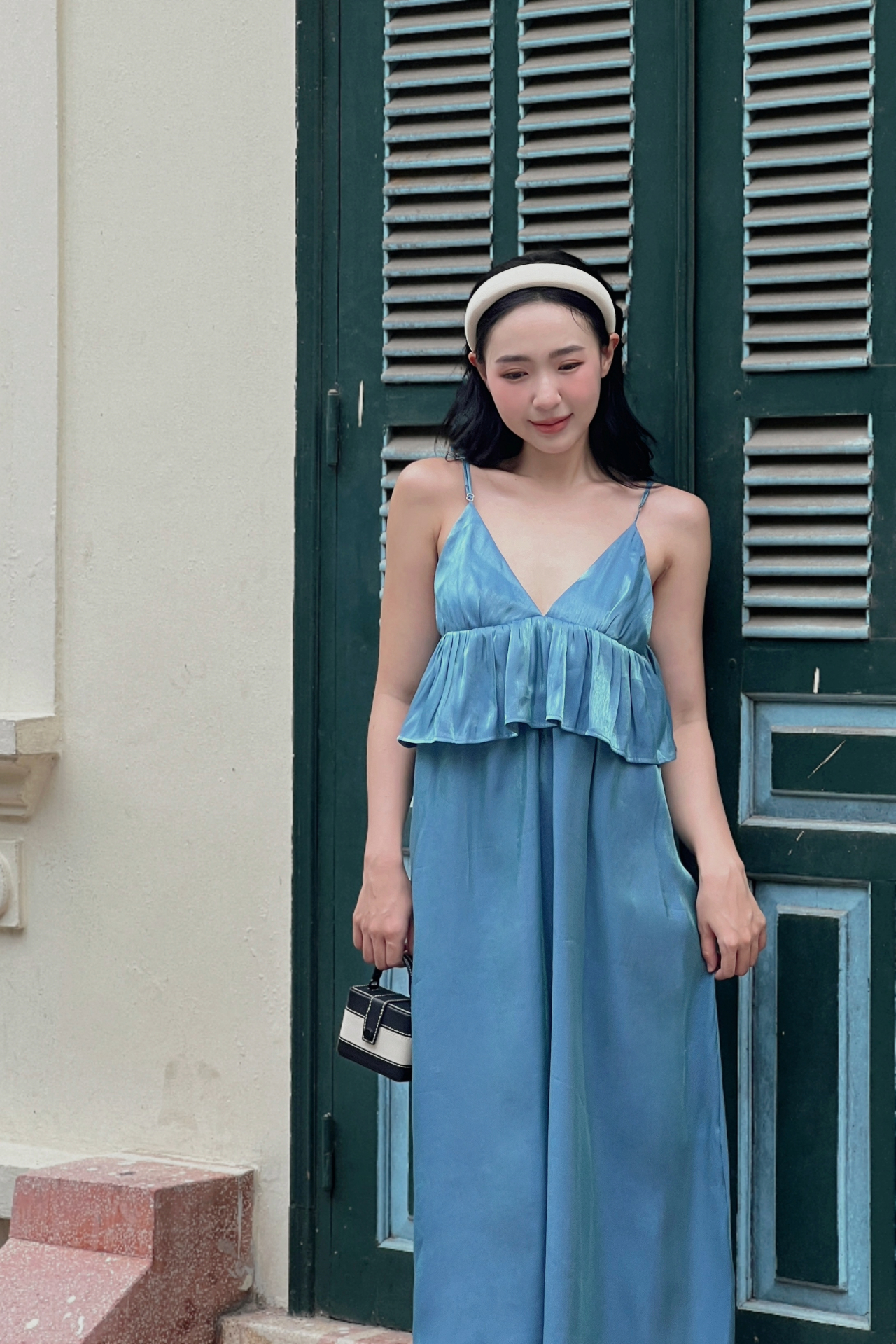 Đầm hai dây cổ V chất liệu organza, dáng suông.
