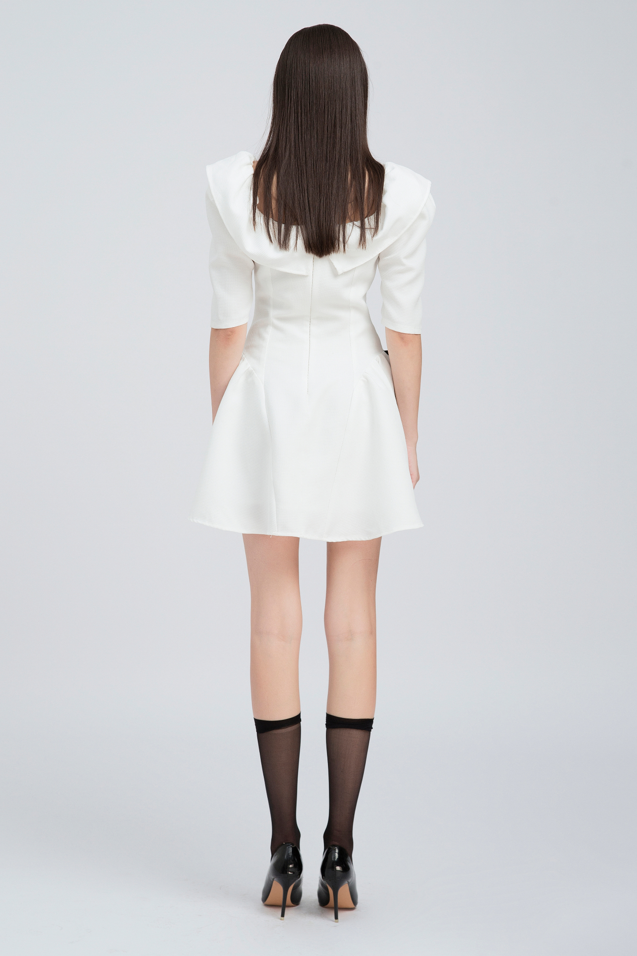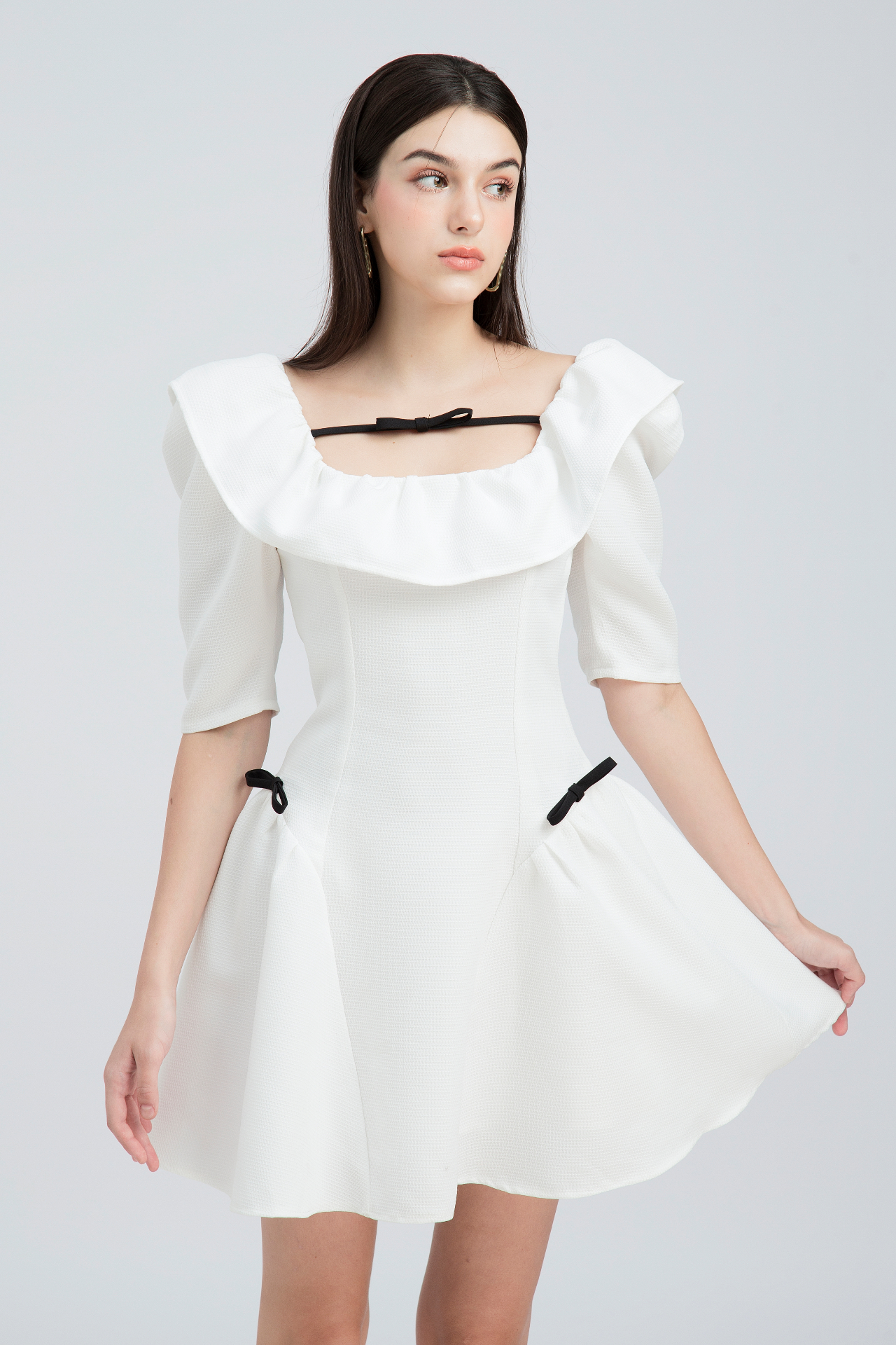 Đầm cổ vuông tay lửng, phối dây nơ ngang trước ngực.