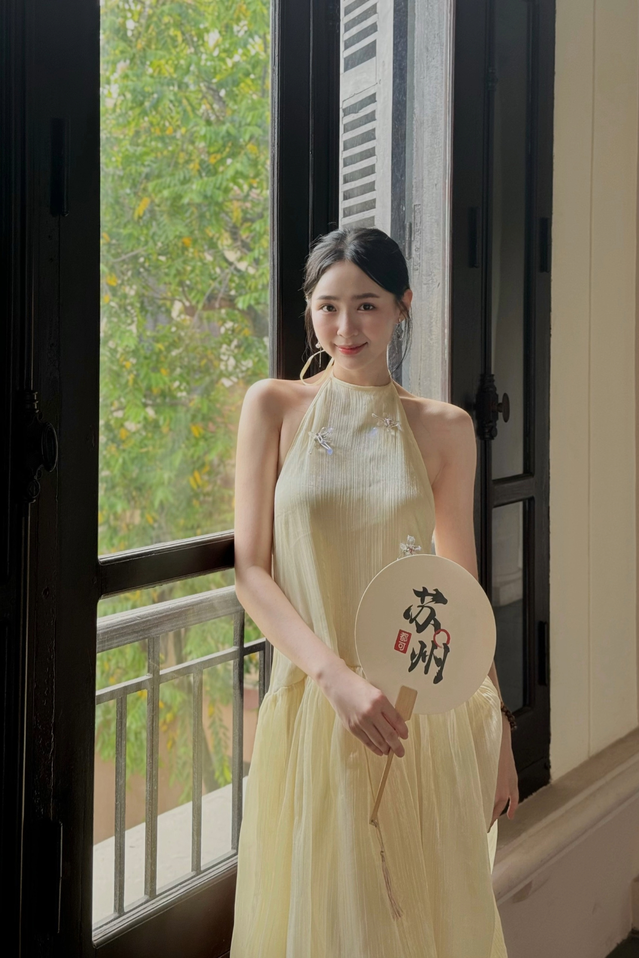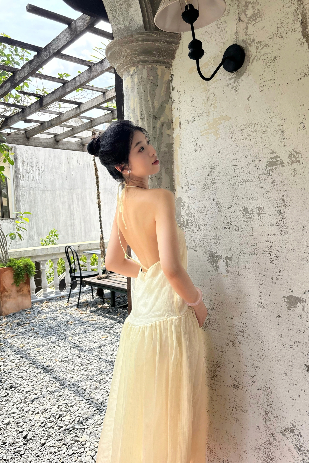 Đầm cổ yếm chất vải tơ cao cấp, đính đá.