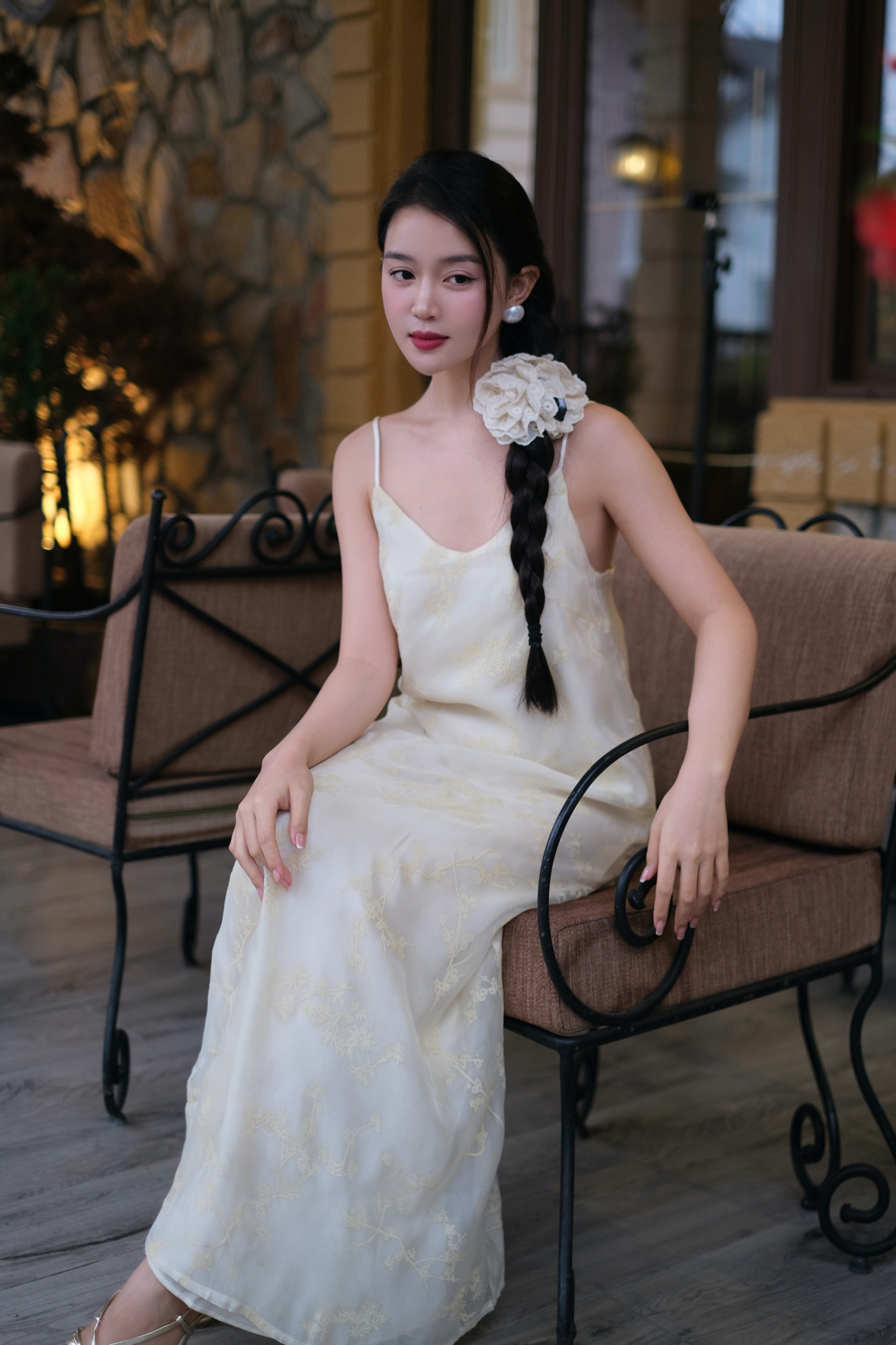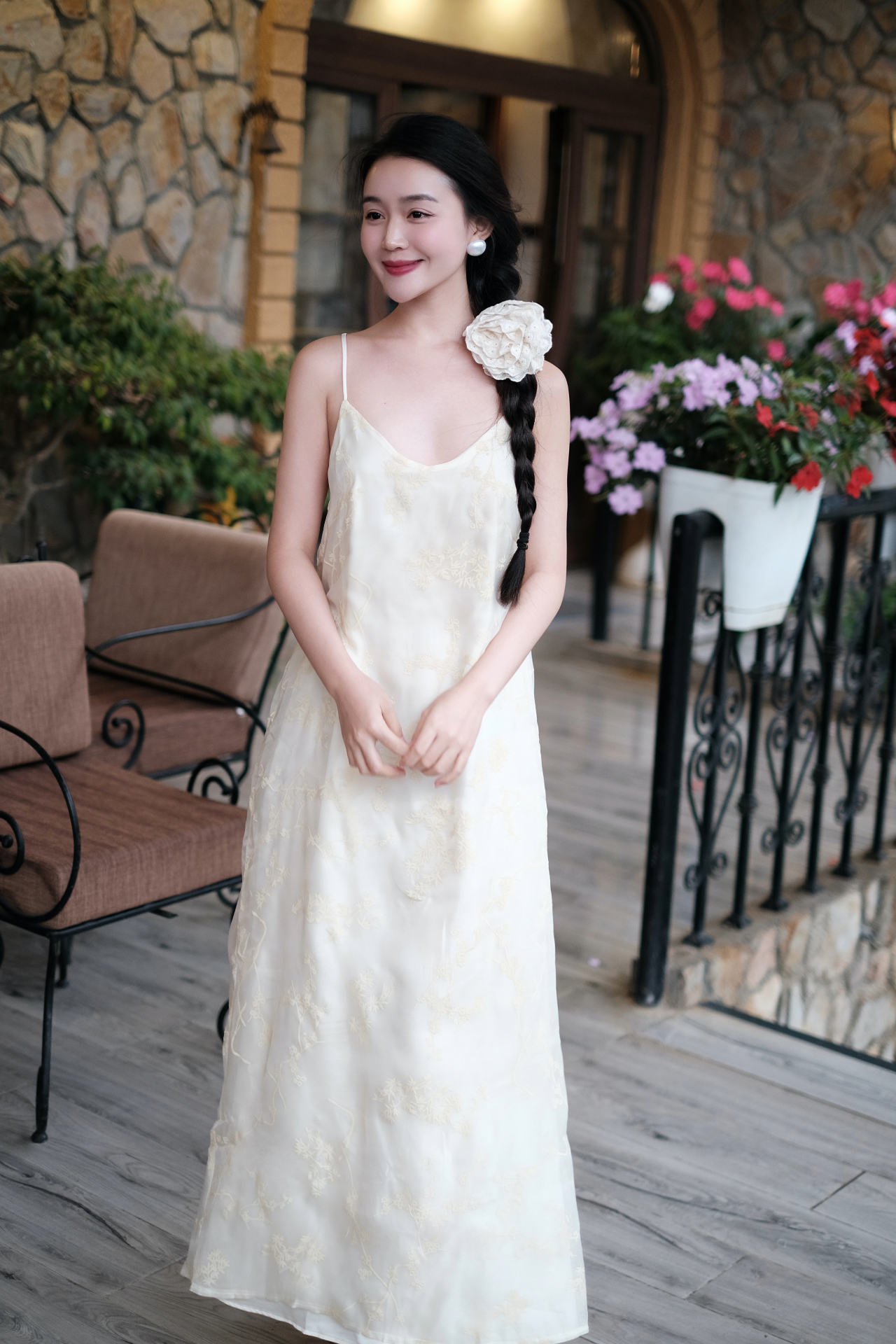 Đầm hai dây dáng rộng, chất vải tơ thêu hoa.