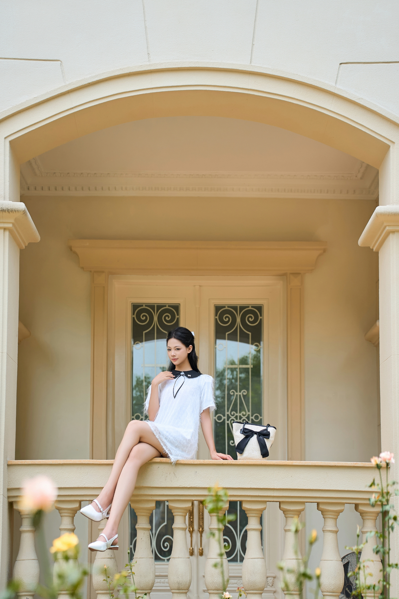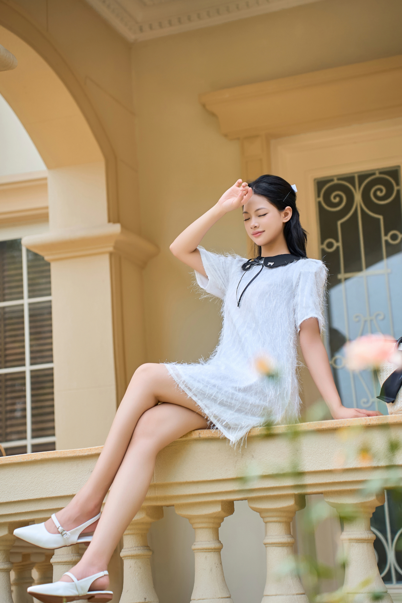 Đầm tay ngắn vải đính lông vũ, phối cổ khác màu.