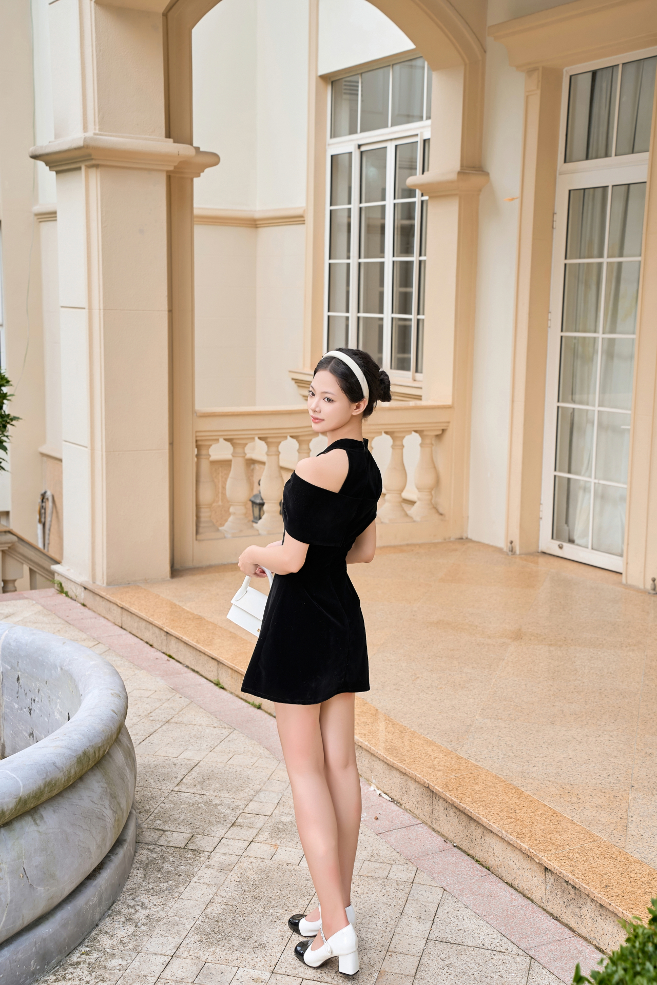 Đầm trễ vai chất vải nhung cao cấp, phối nơ trước ngực.